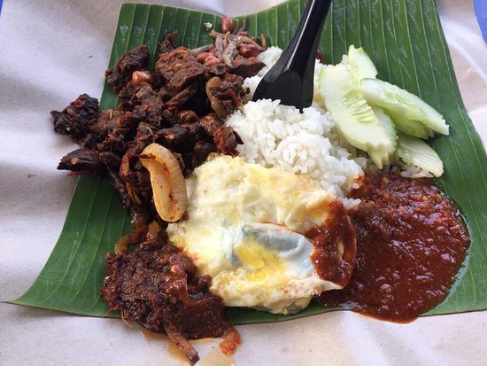 Nasi lemak yang sedap dimasak daripada santan, daun pandan, dan bahan lain, dan biasanya dihidangkan bersama sambal, ikan bilis dan kacang, telur rebus dan timun.